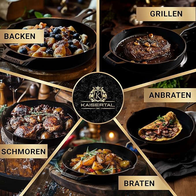 Die KAISERTAL Gusseisenpfanne ist mehr als nur eine Pfanne - sie ist dein Schlüssel zu perfekten Röstaromen und unvergesslichen Geschmackserlebnissen! Mit ihrer optimalen Hitzeverteilung und der großzügigen Bratfläche gelingen dir saftige Steaks, knusprige Bratkartoffeln und aromatische Pfannengerichte im Handumdrehen.