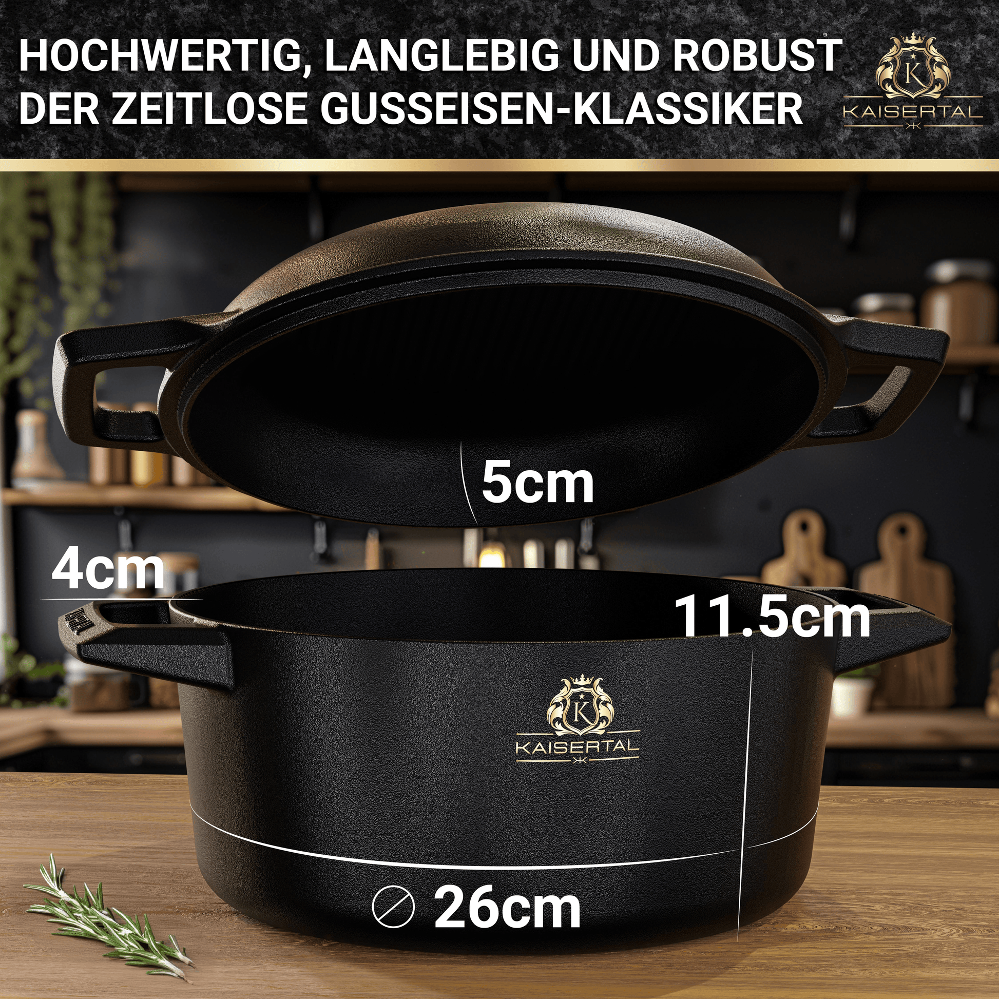 KAISERTAL Gusseisen Topf - 2-in-1 Schmortopf 26 cm mit Deckel (6,4L) - Emailliert/Eingebrannt