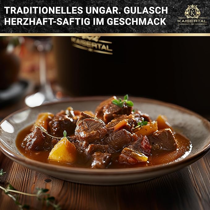 Unser Topf ist perfekt für Gulasch, da das integrierte 3 Punktesystem am Deckelrand dafür sorgt, dass der aromatische Wasserdampf aufsteigt und gleichmäßig auf das Gericht zurücktropft. Dadurch bleibt das Fleisch besonders saftig und geschmackvoll.